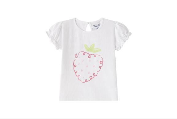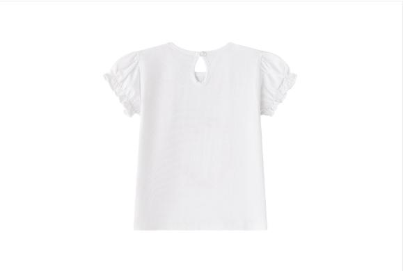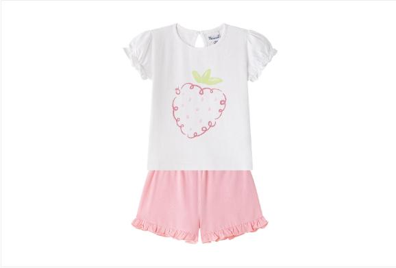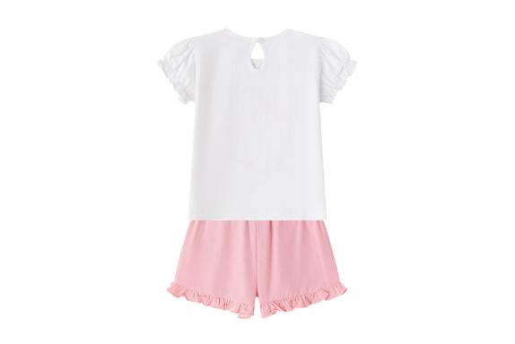 Camiseta M/C con dibujo en la parte delantera y botón en la parte trasera de la prenda. Short de bebé niña, con cintura elastica. Bajo acabado en volante.