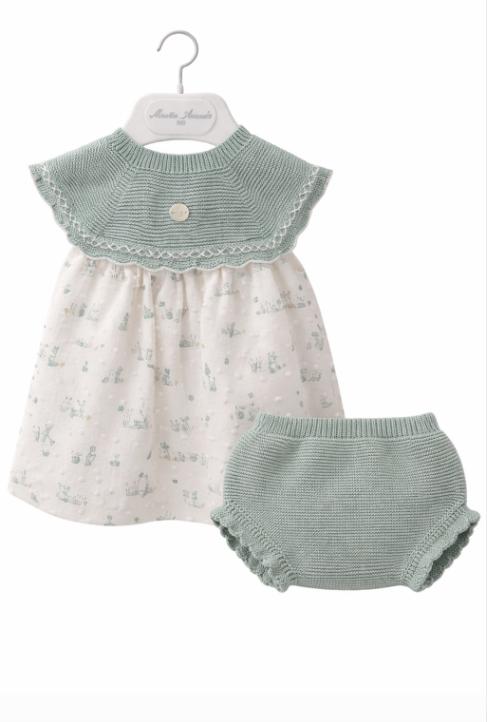 Encantador conjunto para bebé compuesto por vestido y cubrepañal a juego, diseñado en un delicado tono verde agua con un sutil estampado en la falda. La parte superior del vestido está confeccionada en punto suave, con un bonito acabado calado y volante decorativo que aporta un estilo dulce y artesanal.